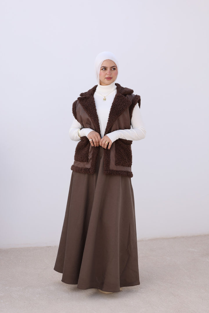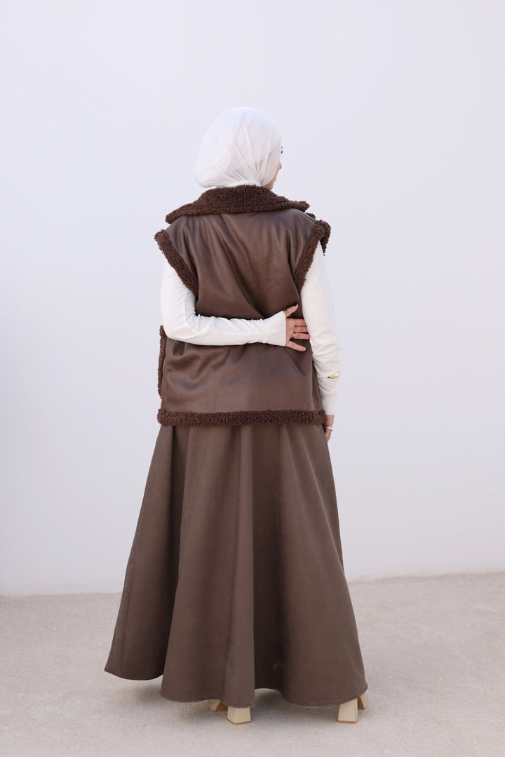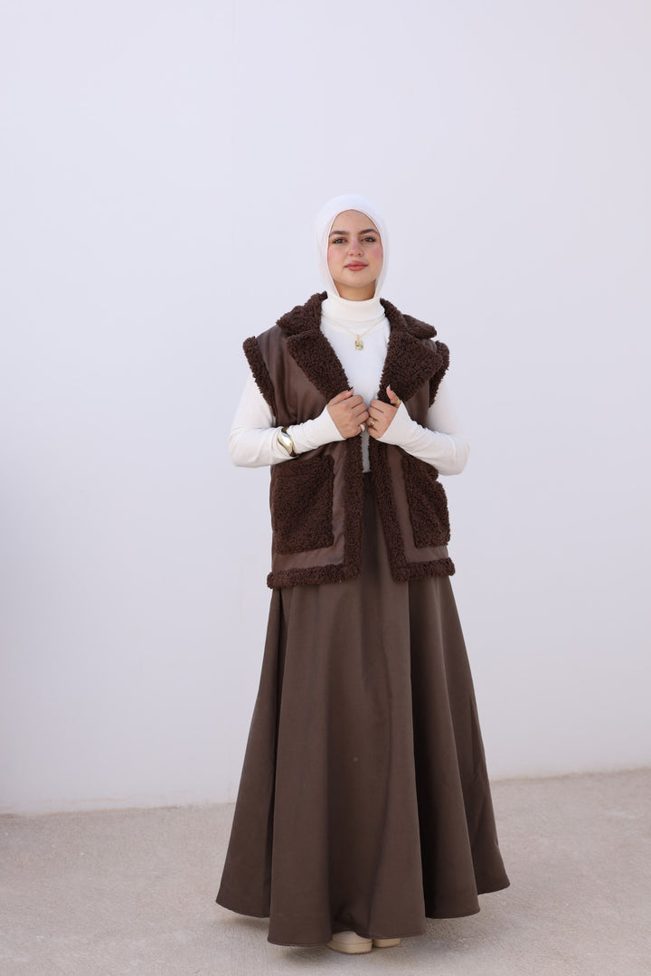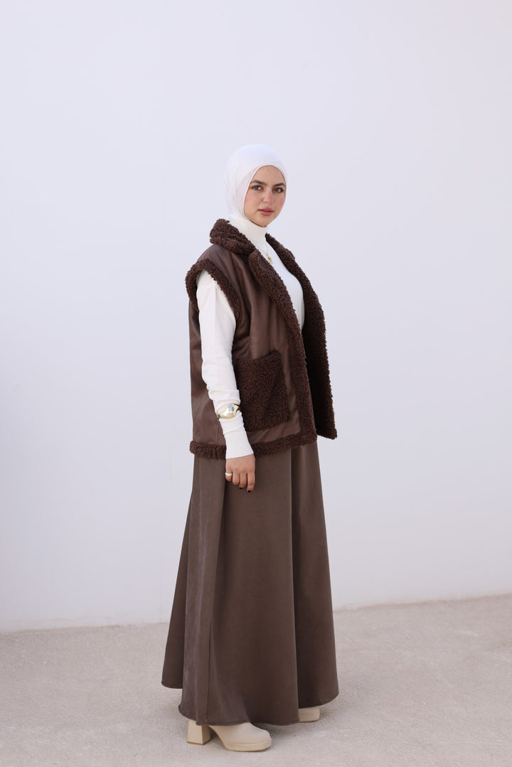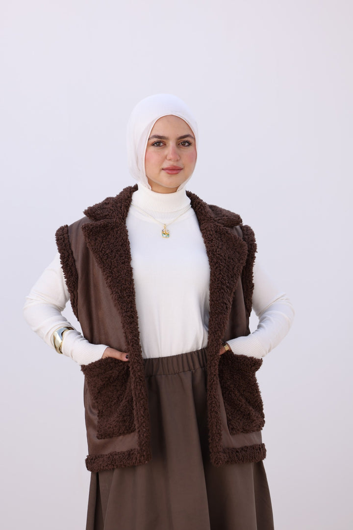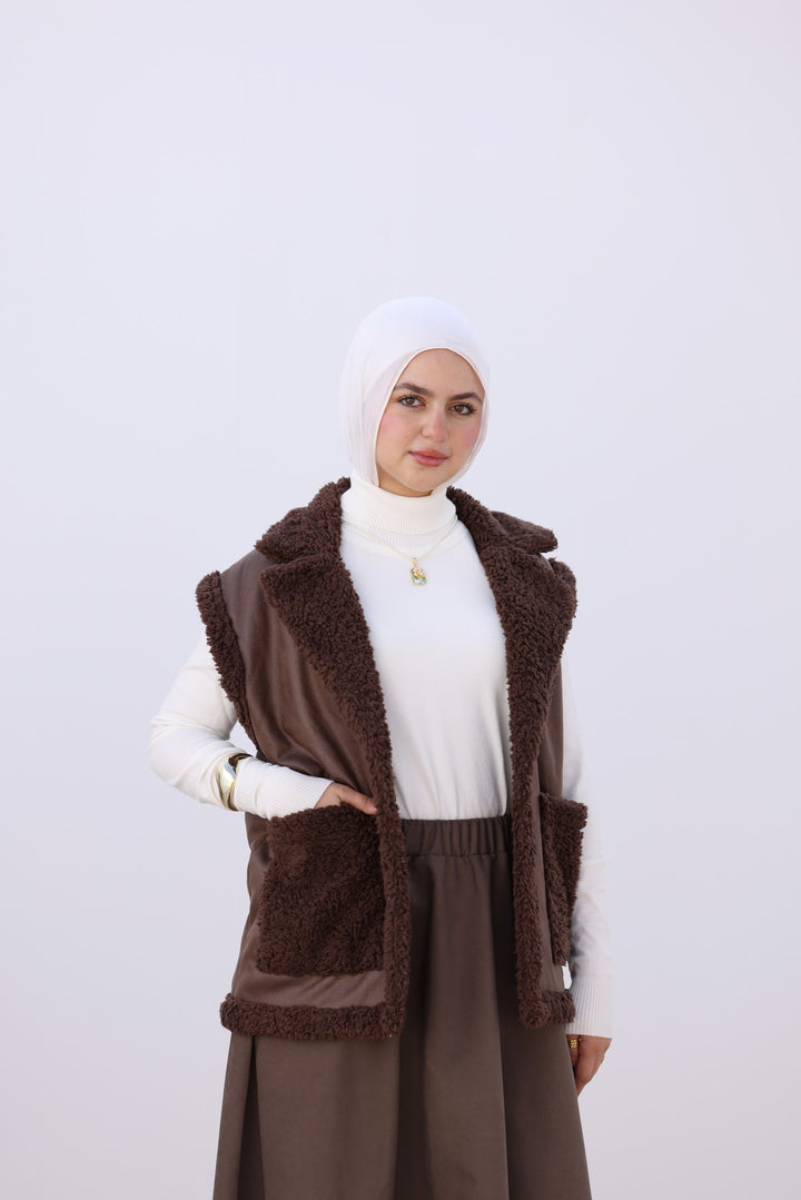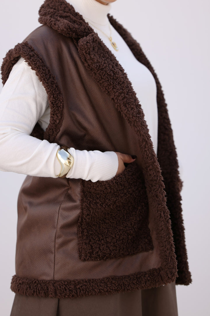 Cozy faux leather vest with soft teddy lining and big front pockets — perfect for layering on chilly days. Pair it with your favorite sweater for an effortless winter look!
